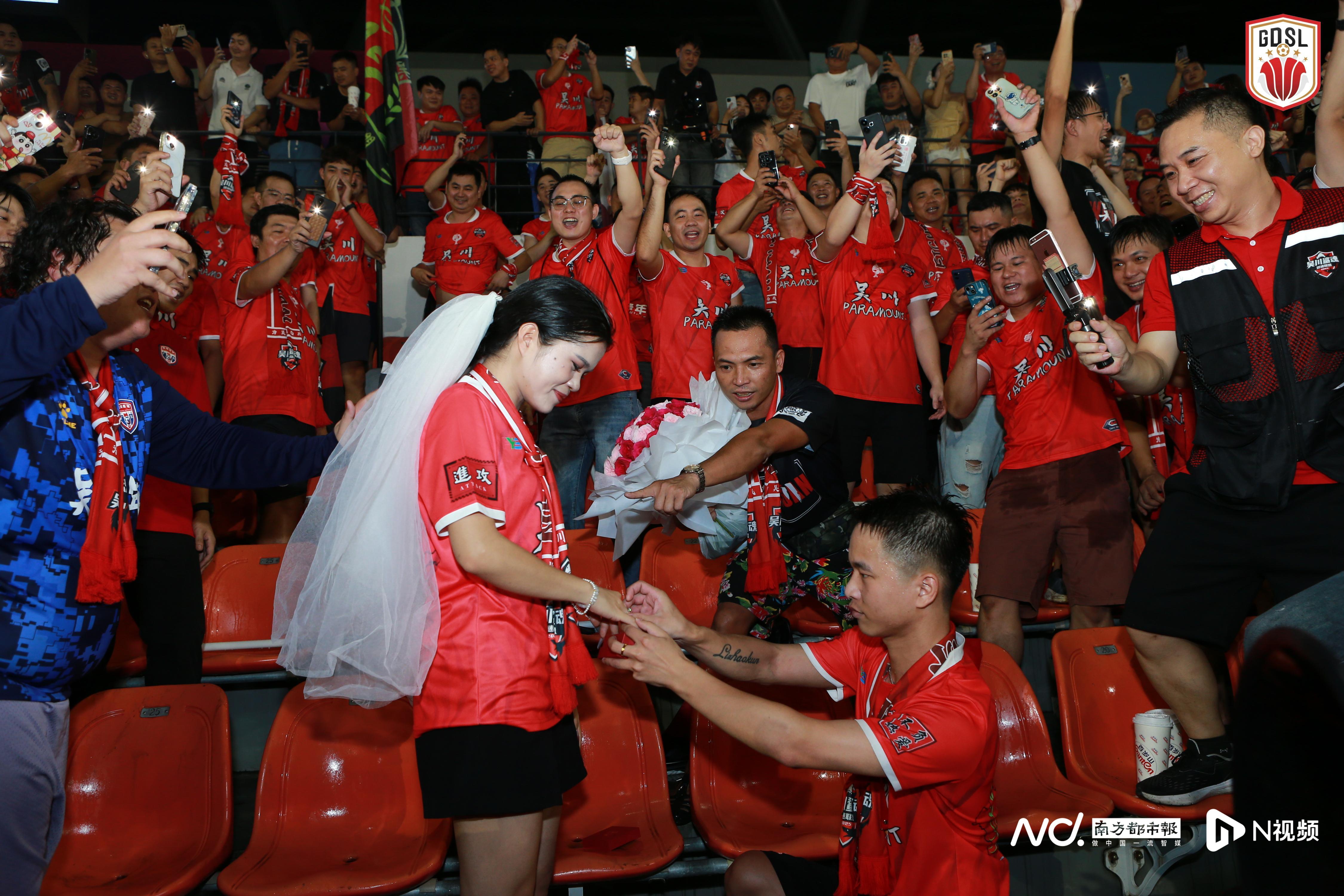 彼时,吴川青年队球迷李先生掏出戒指,向准备共度一生的爱人求婚。当他单膝跪地,女友接过戒指的瞬间,全场球迷不约而同地高呼起来,纷纷为这对情侣送上掌声与祝福。